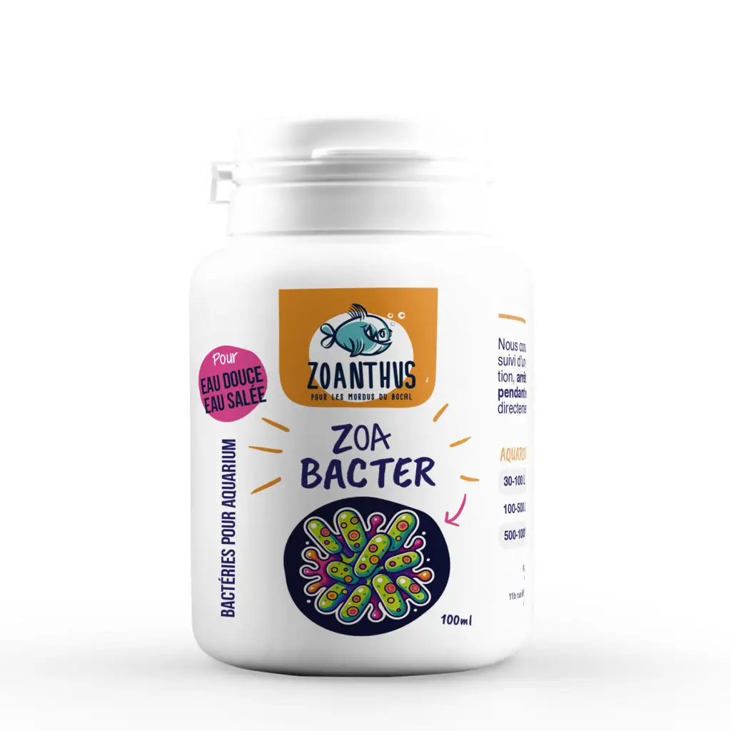 ZOA Bacter est un concentré de bactéries vivantes non pathogènes fixées sur un substrat de maërl, pensé pour stabiliser l’équilibre biologique en aquarium d’eau de mer comme d’eau douce. Son consortium multi-souches concurrence naturellement les algues indésirables, abaisse nitrates et phosphates par assimilation, et transforme les dépôts organiques en ressources pour la filtration. Résultat : vitres plus propres, eau claire et biotope plus sain. Les poissons et coraux retrouvent vitalité et résistance (protection vis-à-vis des vibrioses), tandis qu’un biofilm bénéfique se met en place pour nourrir certains invertébrés. Compatible avec écumeur et filtres, l’effet se voit rapidement, surtout en présence d’un brassage correct. Flacon 40 ml (34g) – 109 CFU/g, sans OGM, pas de risque de surdosage.